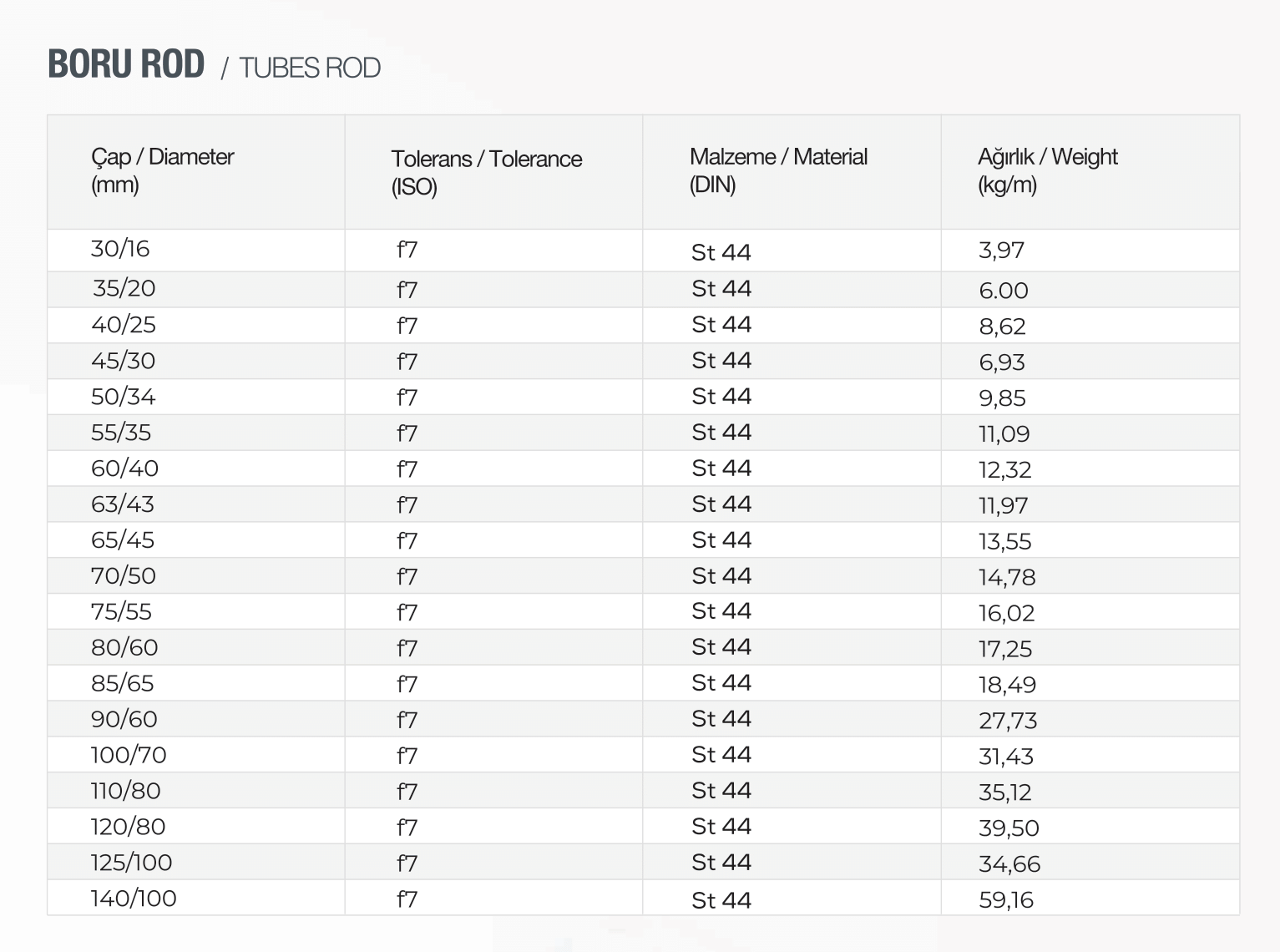 Eferen Hidrolik tarafından üretilen boru rodlar, yüksek dayanımlı çelikten imal edilen, yüzeyi hassas taşlanmış ve isteğe göre krom kaplama uygulanabilen silindirik millerdir. Yüksek yüzey kalitesi ve doğruluk toleransları sayesinde düzgün ve sessiz bir çalışma sağlar.