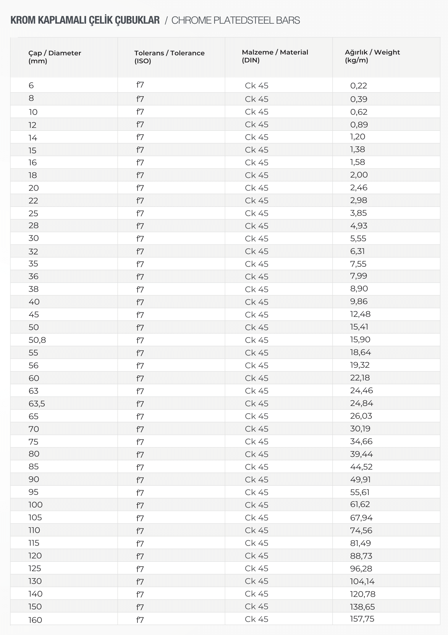 Eferen Hidrolik tarafından üretilen krom kaplamalı çelik borular ve miller, yüzeyine sert krom kaplama uygulanarak yüksek korozyon direnci, aşınma dayanımı ve düşük sürtünme kazandırılmış hassas çelik ürünlerdir. Genellikle indüksiyonla sertleştirilmiş ve parlatılmış yüzey yapısına sahiptir.