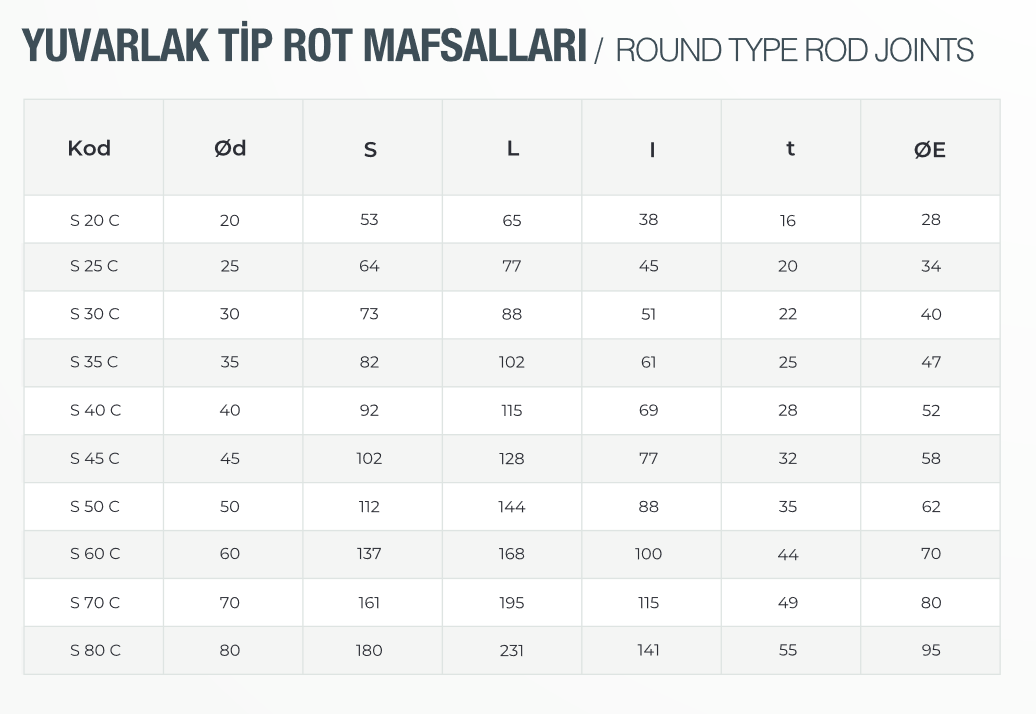 Eferen Hidrolik tarafından tedarik edilen yuvarlak tip rot mafsalları, iki hareketli parça arasında dönme ve salınım hareketini sorunsuz iletmek için tasarlanmış bağlantı elemanlarıdır. Gövdesi genellikle çelik veya paslanmaz çelik malzemeden üretilir, iç kısmında küresel yatak bulunur ve yüksek darbe dayanımı sağlar.